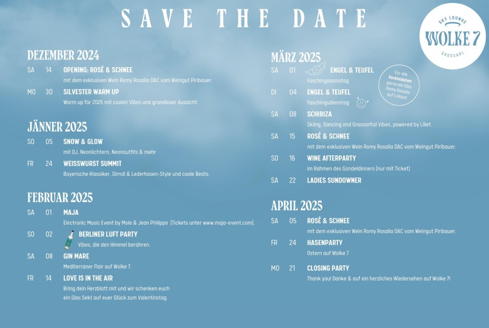 Parties are meant to be celebrated and Wolke7 at the top station of the Kieslerbahn cable car is the perfect place to do so. Various parlours await you inside and we can cater for up to 140 people on the terrace. You should definitely come and have a look.